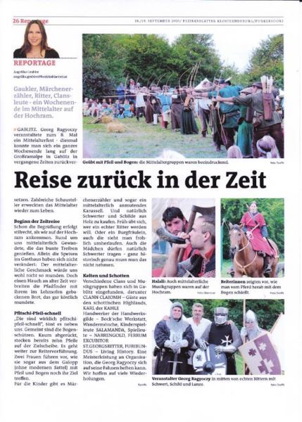 Nach Wochen und Monaten des eisernen Trainings, war der große Tag unseres ersten Auftritts nun endlich da. Vom 14-15 September 2013 durften wir unser Können am Mittelalterfest in Gablitz erstmals zeigen. Von Heinz und seinem treuen Mercedes Bus wurden unsere Buben Specki und Tchaad behutsam aus dem heimatlichen Stall in den Wienerwald kutschiert.